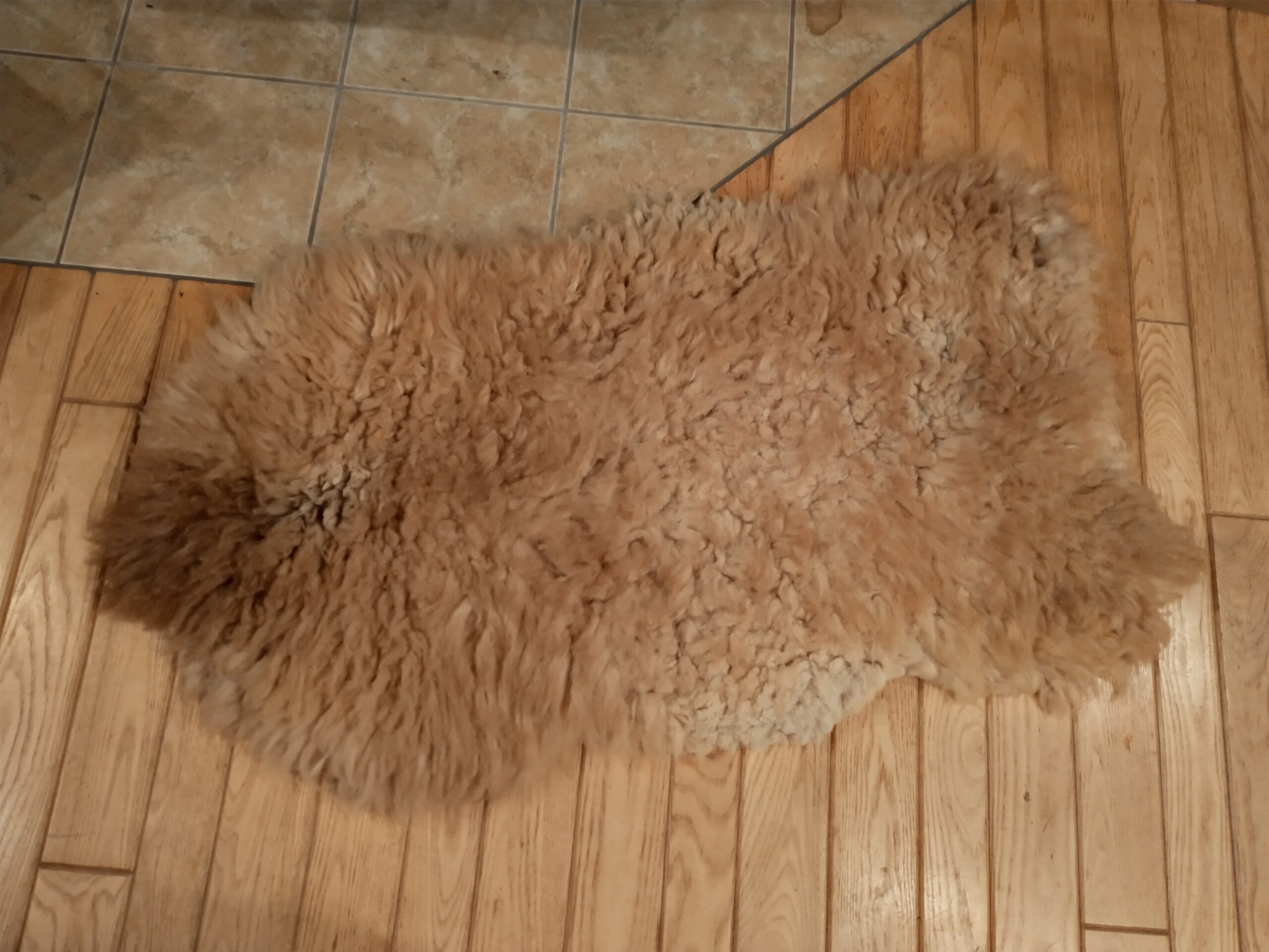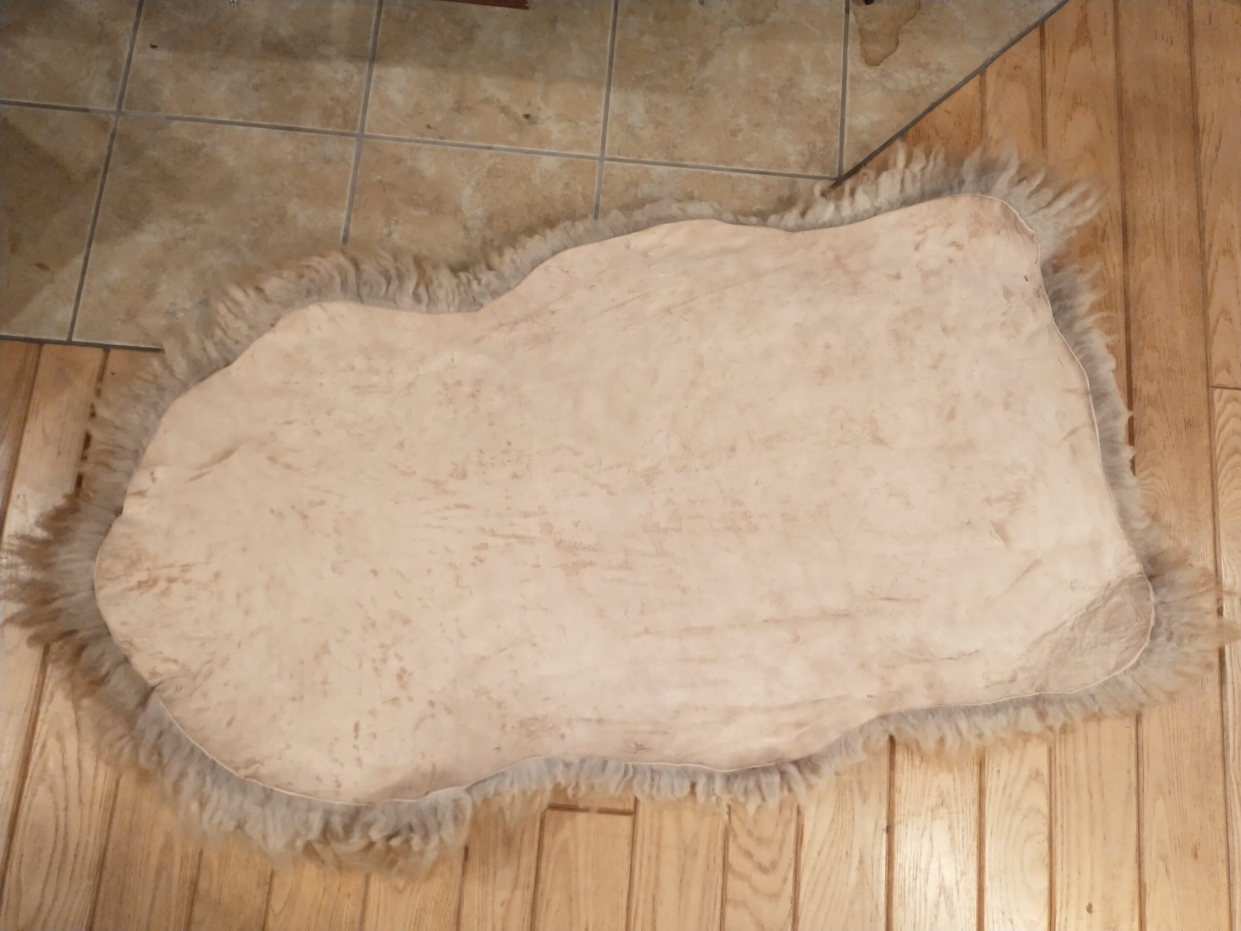 Each sheepskin is unique! This sheepskin is 44 inches long, 25 inches wide at the belly. Natural, unbrushed texture in the fleece allows the animal’s uniquess to shine.