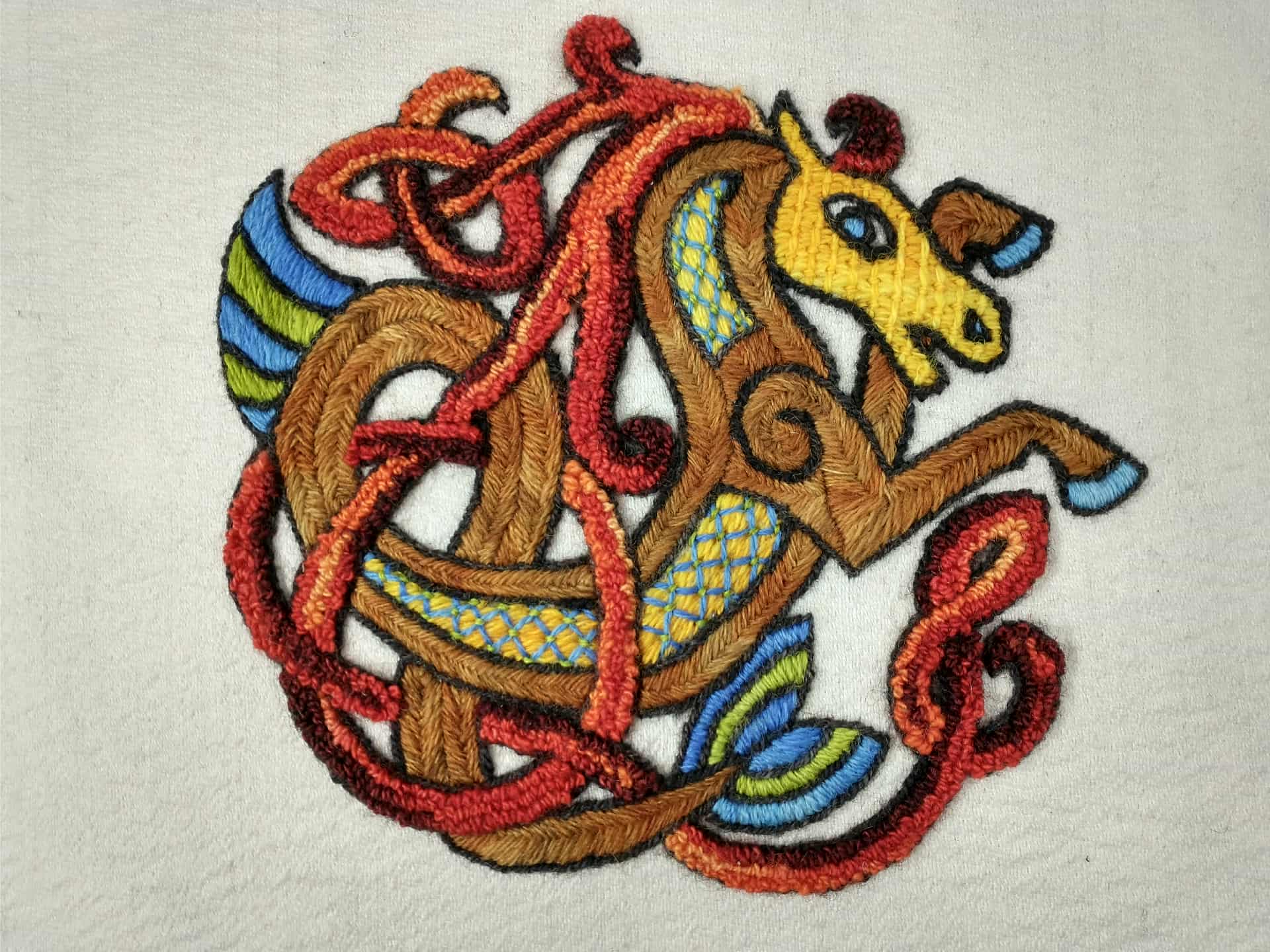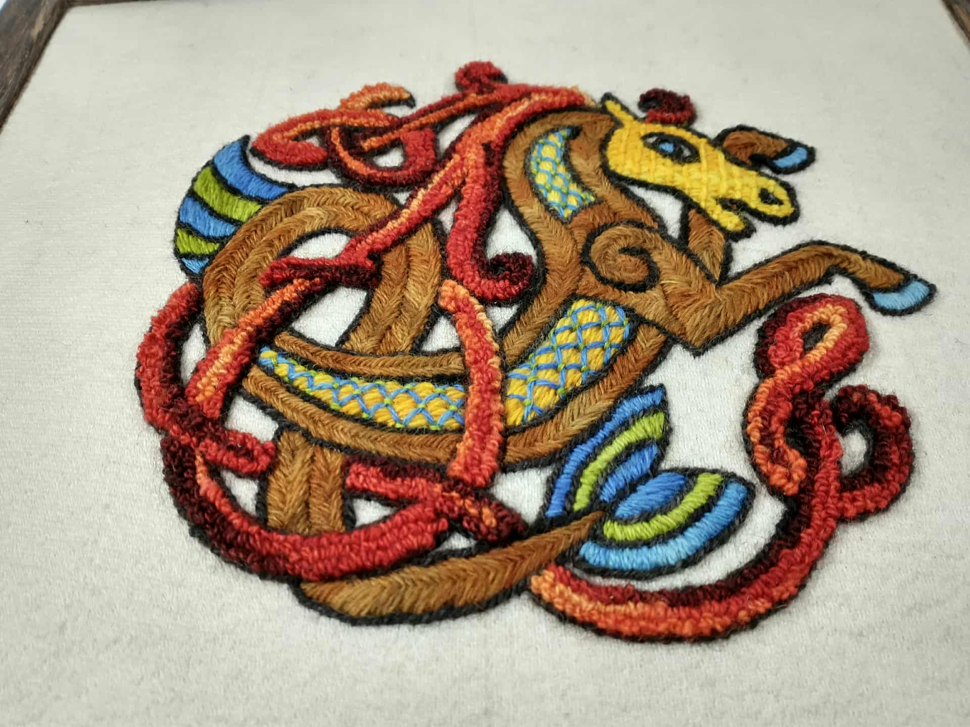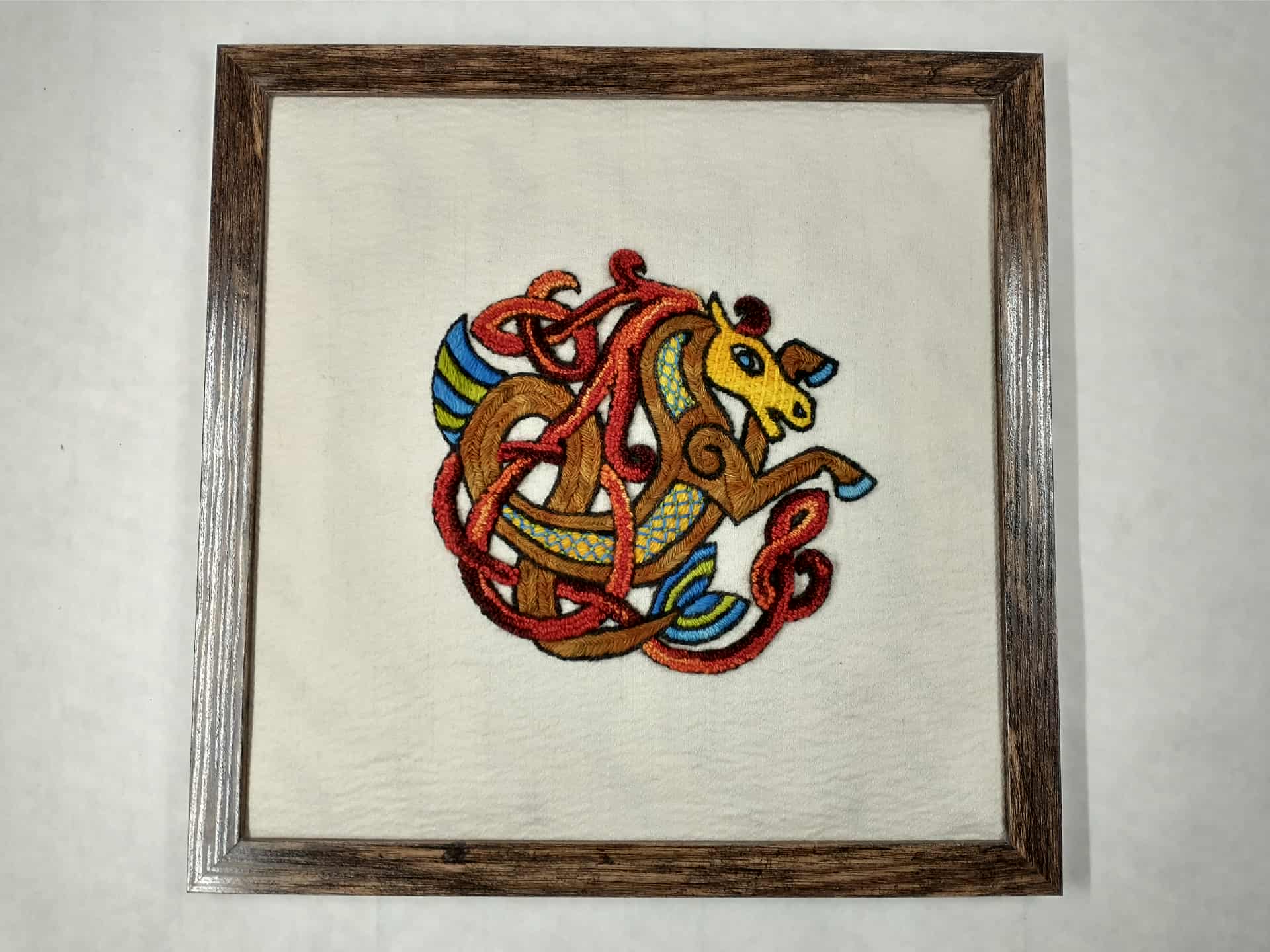 Beautiful unique embroidery in traditional design stitched and punched by Laura Berlage using wool from our sheep.  Framed dimensions are 13×13 inches.  Ready for hanging on the wall.  Add charm and a touch of magic with this beautiful piece.