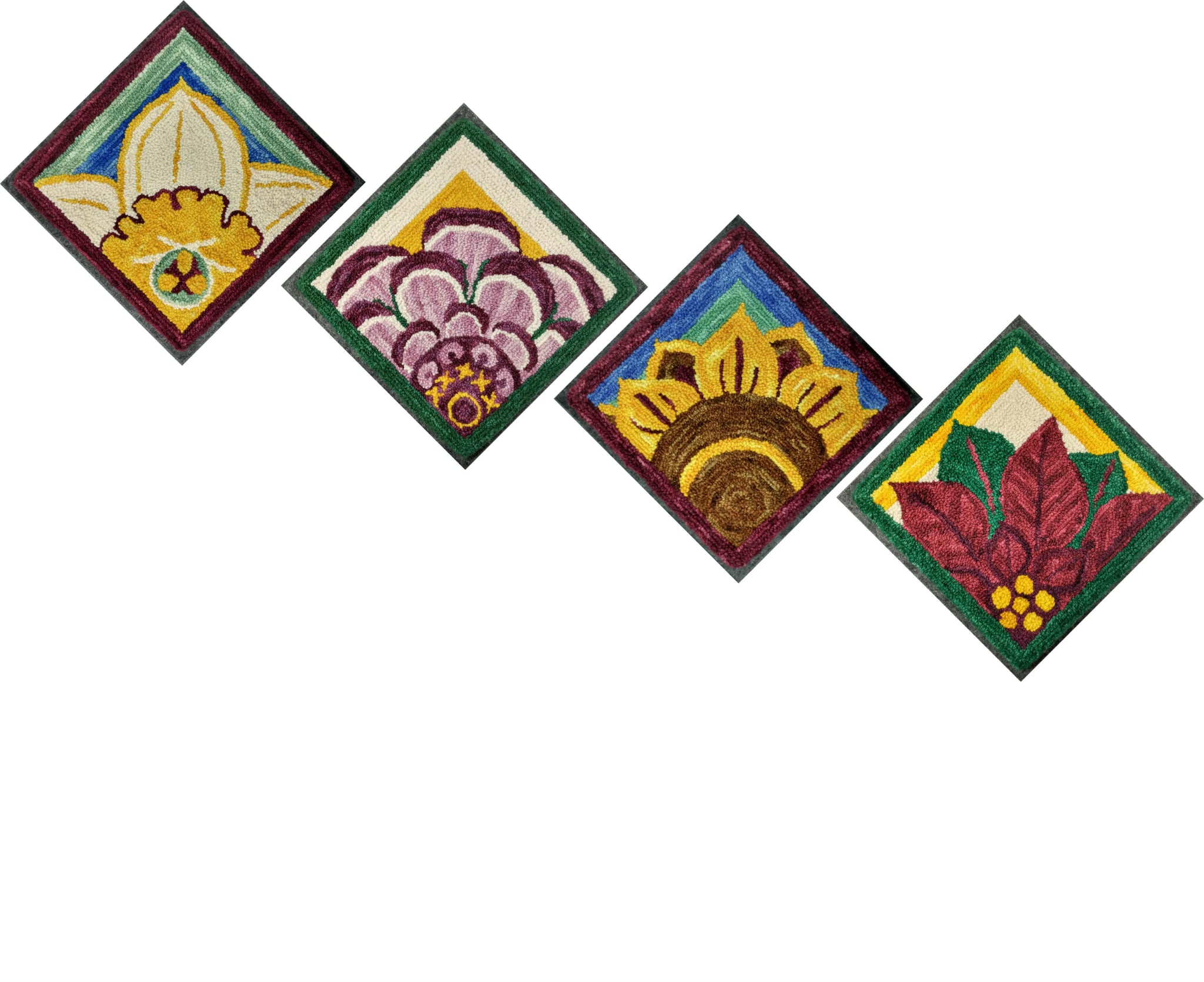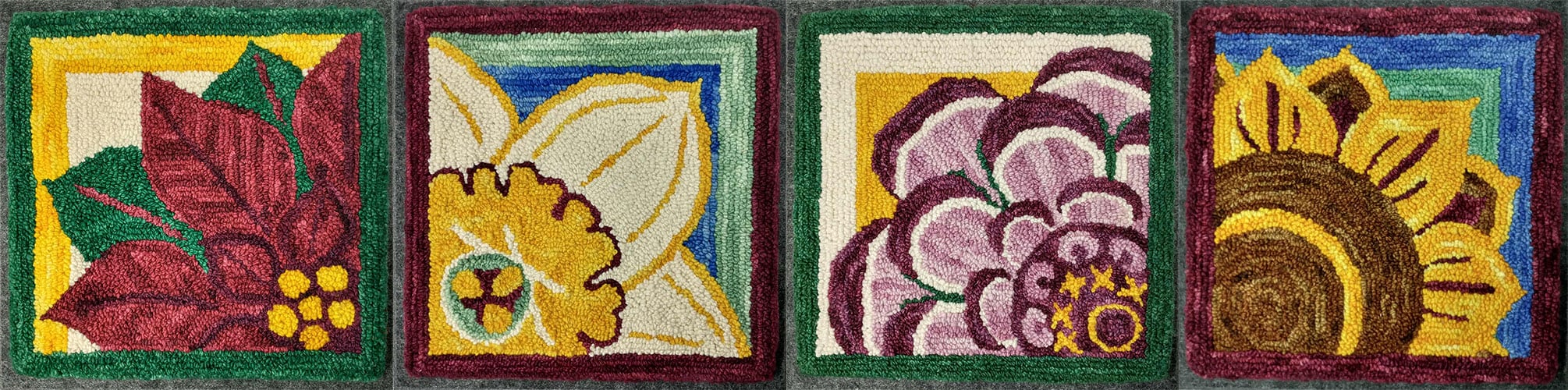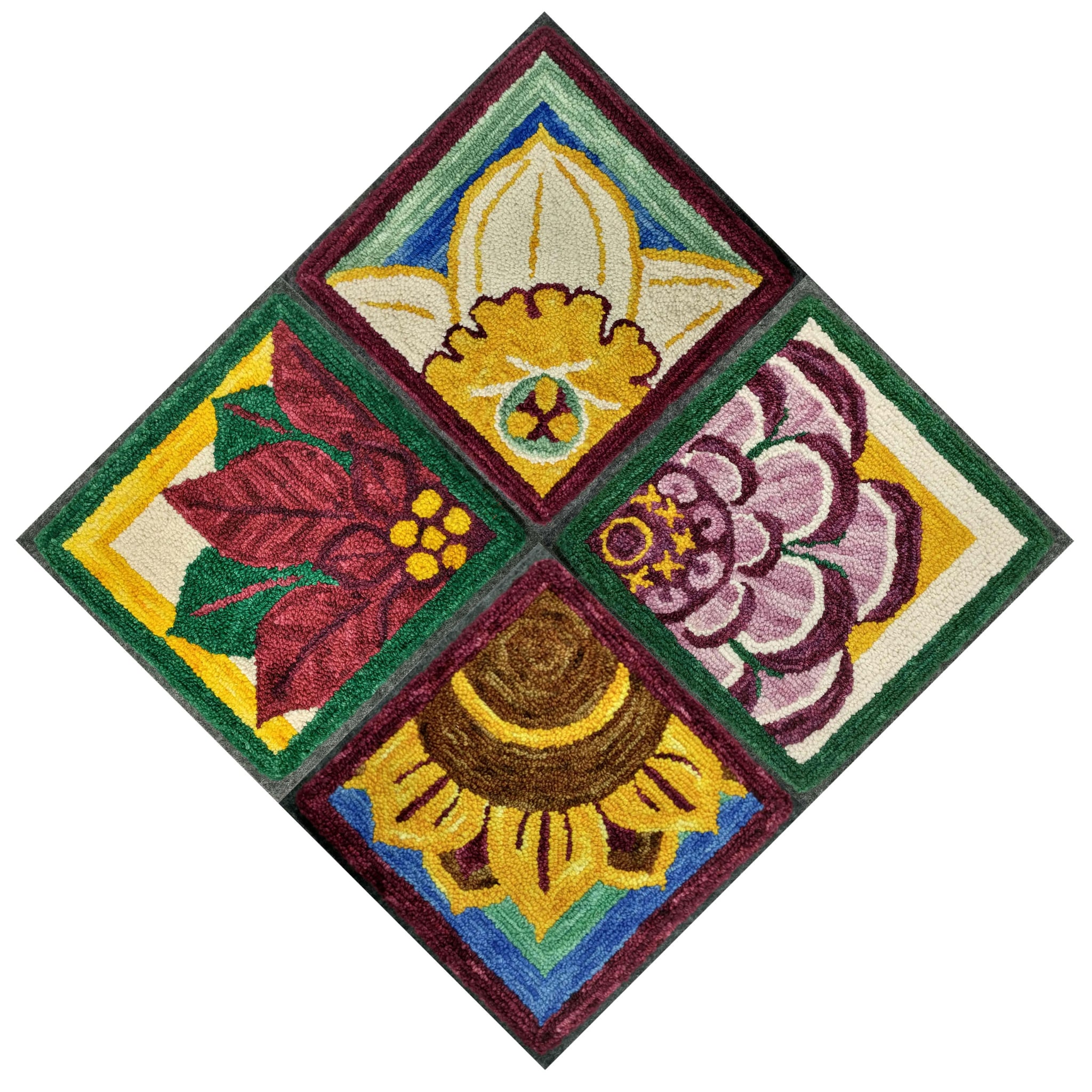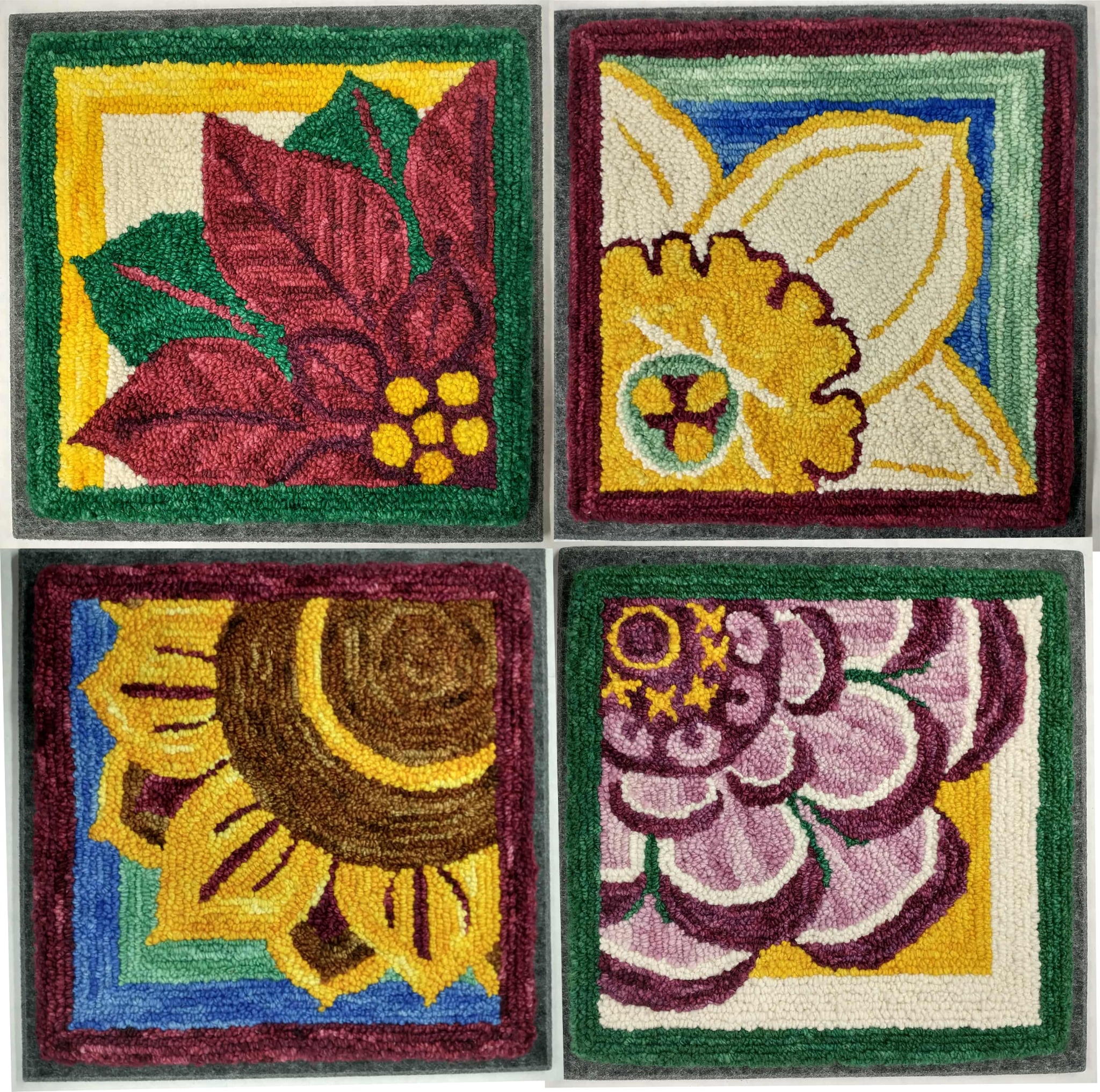 Celebrate the beauty of the seasons with this set of modular art, ready for mounting on the wall in 12×12 inch panels of felt board. Each piece is designed and created by Laura using punch needle rug hooking and hand dyed yarn made from the wool of our sheep. Because the pieces are individually mounted (comes with an adhesive back), you can display them in a number of creative arrangements! Pictured are some ideas for inspiration, but you can also choose your own orientation to fit your space and style.