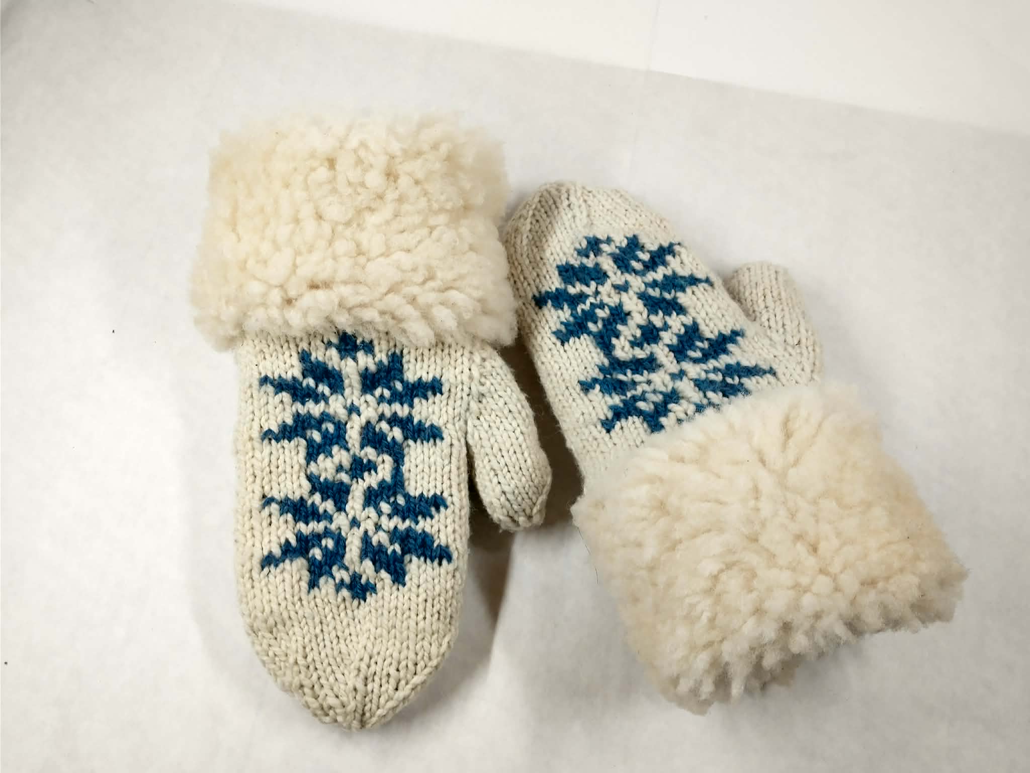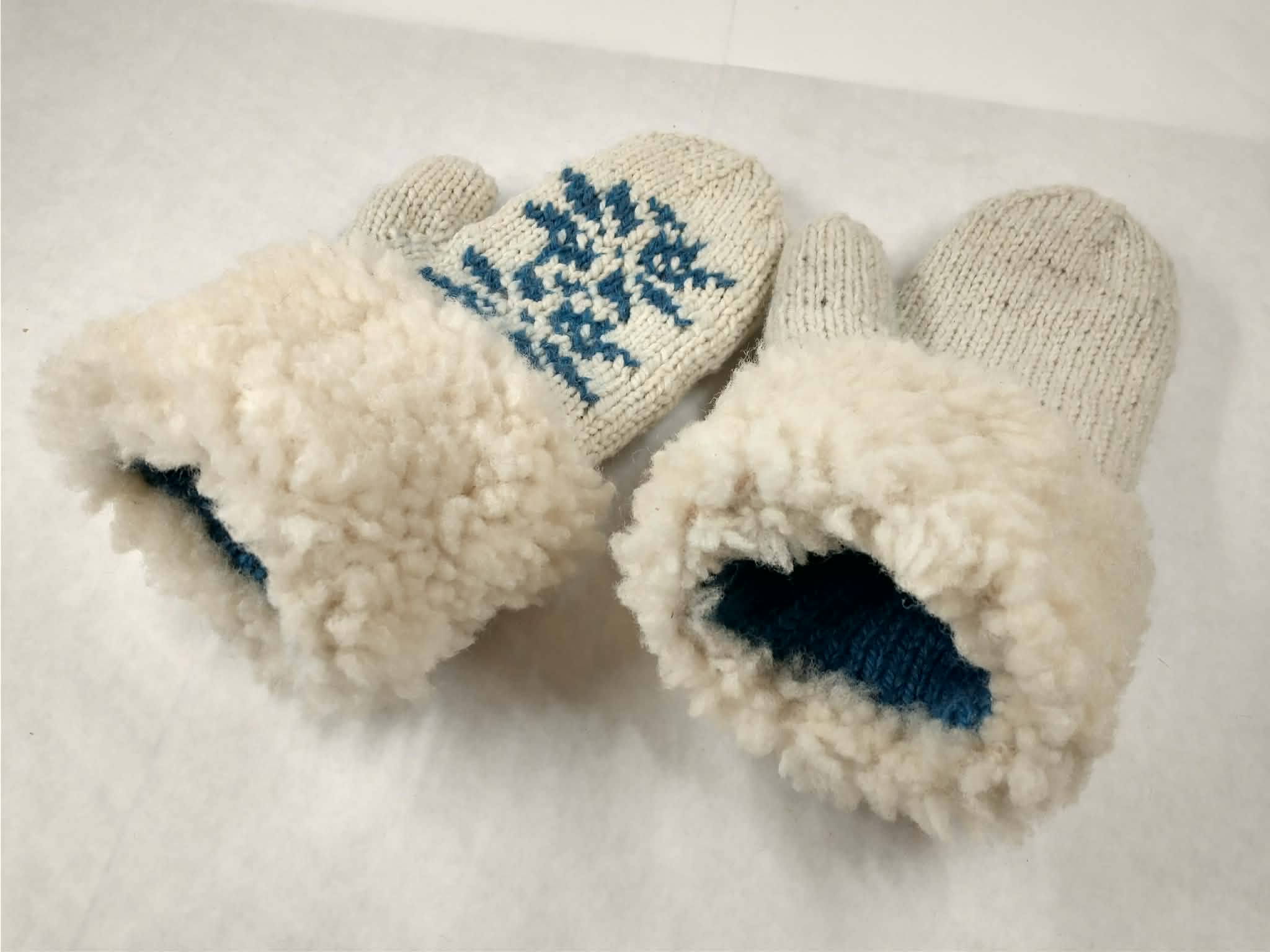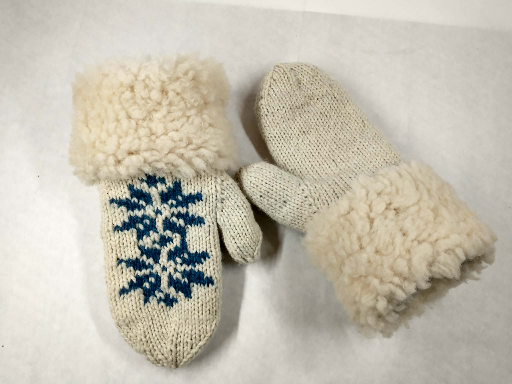 Wondrously warm! These mittens are double-thick, using a technique that knits the inside and the outside at the same time. In the patterned area, the inside color is brought to the outside, and the outside color comes to the inside. This makes the mittens fully reversible! Made with wool from our sheep. Cuffs covered with shearling sheepskin from our sheep.